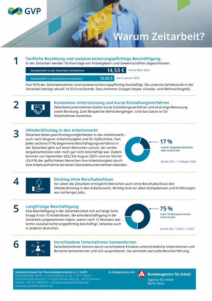 Die Arbeitnehmer/innen sind feste Angestellte des Zeitarbeitsunternehmens und profitieren bspw. von einem festen Arbeitsplatz, Tarifverträgen, zahlreichen Weiterbildungen und bezahltem Urlaub.
